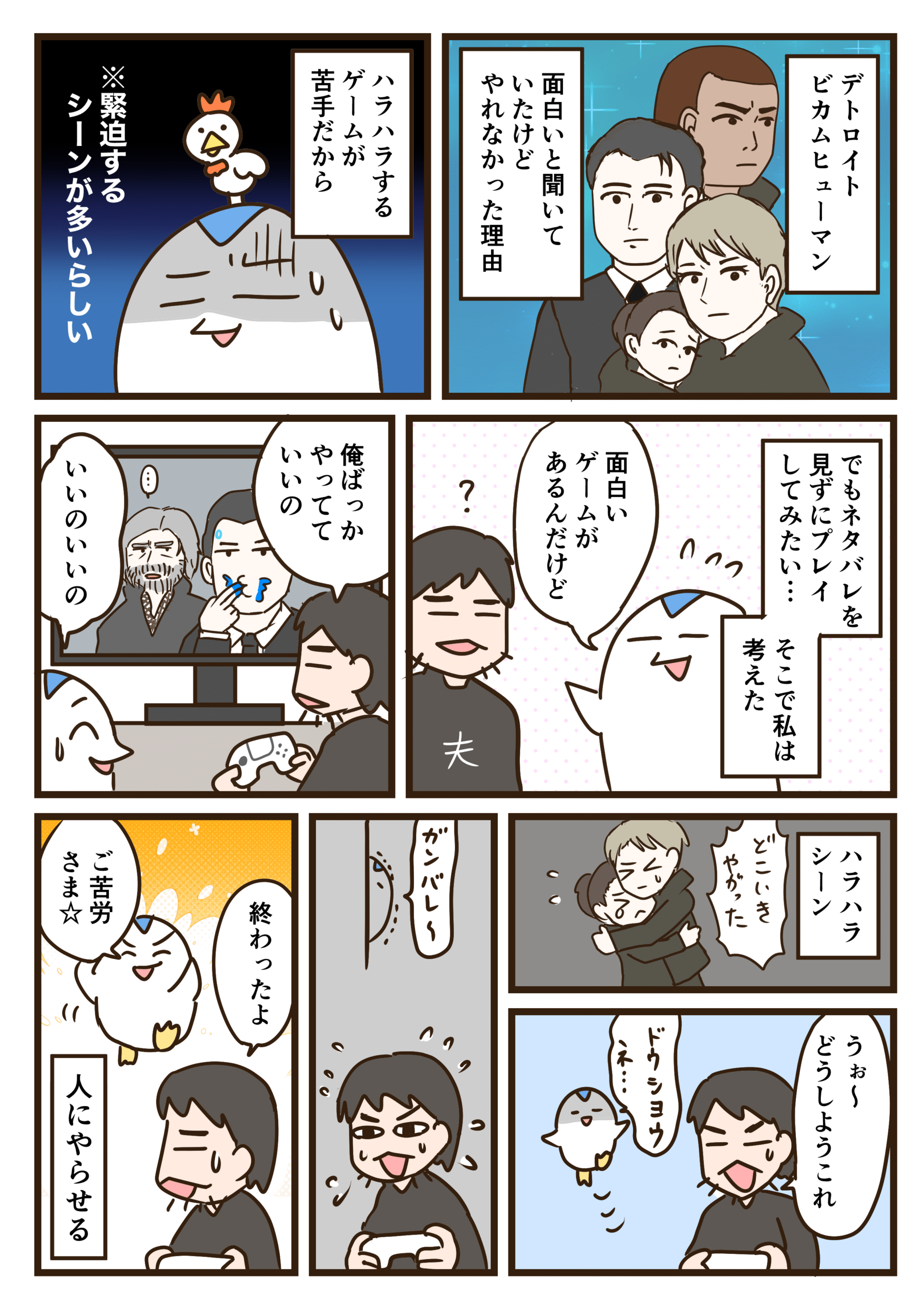 ゲーム メンタル激よわ人間のゲーム術 ne-byi 2025年9月5日 デトロイトビカムヒューマン! ホラーもダメなんですがハラハラ系ゲームもダメな私…。 でも評判がいいからずっとやりたかった。 というわけで夫にやってもらいました笑(ありがとう) 1週目はバッドエンドでしたが2週目はハッピーエンドにできました! すごく面白かったです! 読んでくださりありがとうございます。 ブログ村ランキングに参加しています。 押していただければ励みになります! にほんブログ村